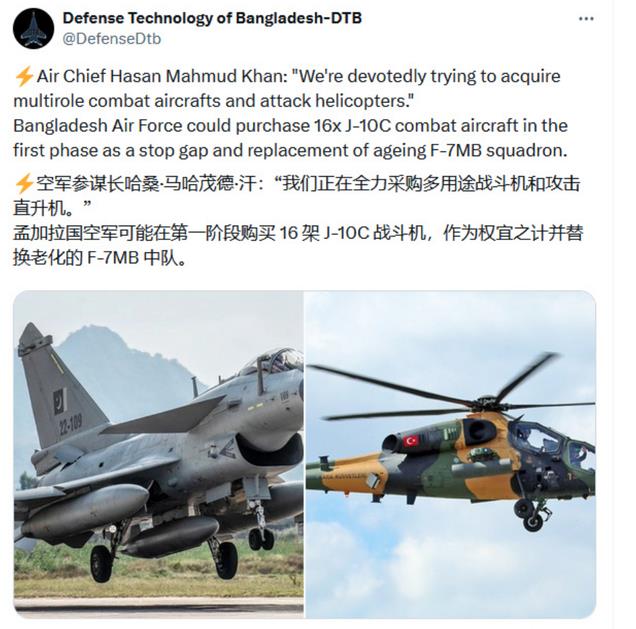 根据根据孟加拉国媒体12月14日的报道,孟加拉空军司令哈桑·马哈茂德·汗表示,孟加拉正在寻求从中国采购16架歼-10C多用途战斗机,用于替换老旧的F-7MB战斗机。