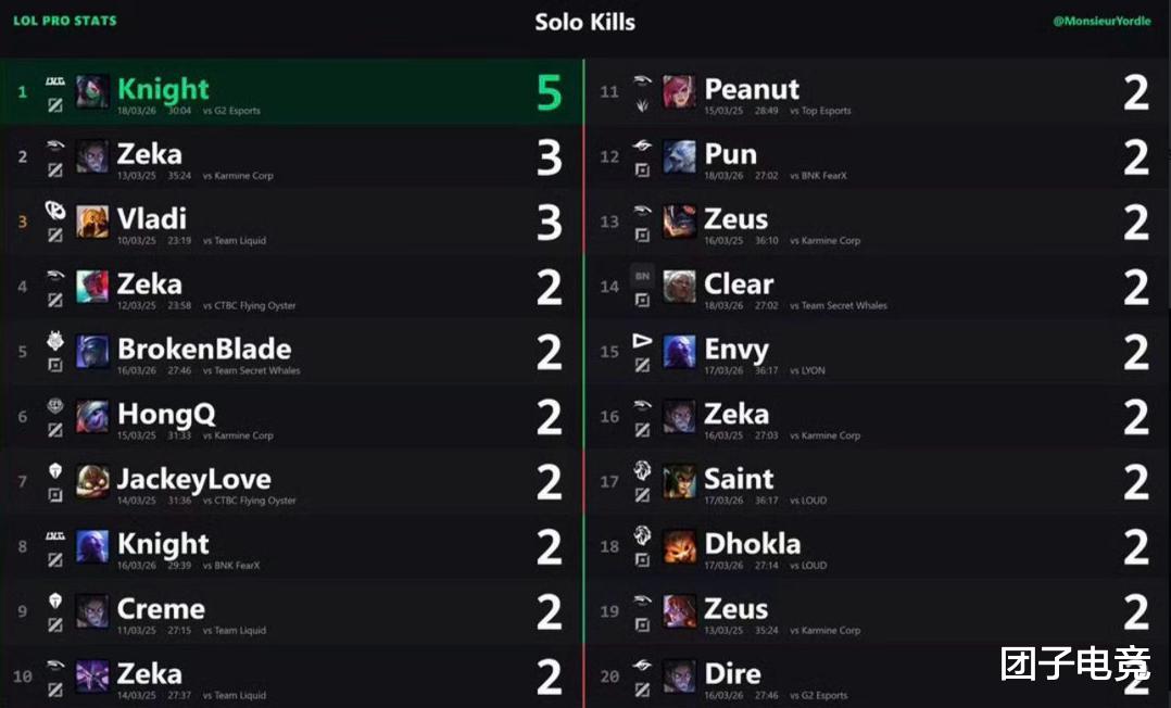 值得一提的是,由于左手最后的一个杀三个BLG没有其他队友在附近,因此直接被判定成了单杀,左手也是成为了世界赛上单杀次数最多的选手,恭喜左手创造历史。