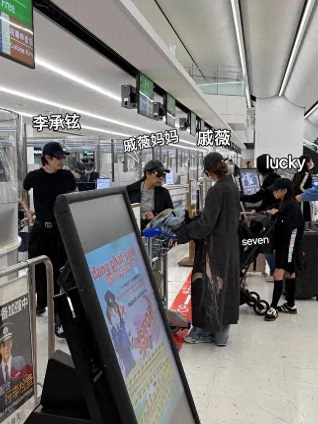 照片中,只见李承铉站在前面办手续,戚薇在后面推着行李车,lucky 则在最后面推着一个婴儿车,坐在里面的应该是2岁多的弟弟seven。而在戚薇旁边还有一位很眼熟的女士,应该是戚薇妈妈,一家人五一出游画面好温馨。