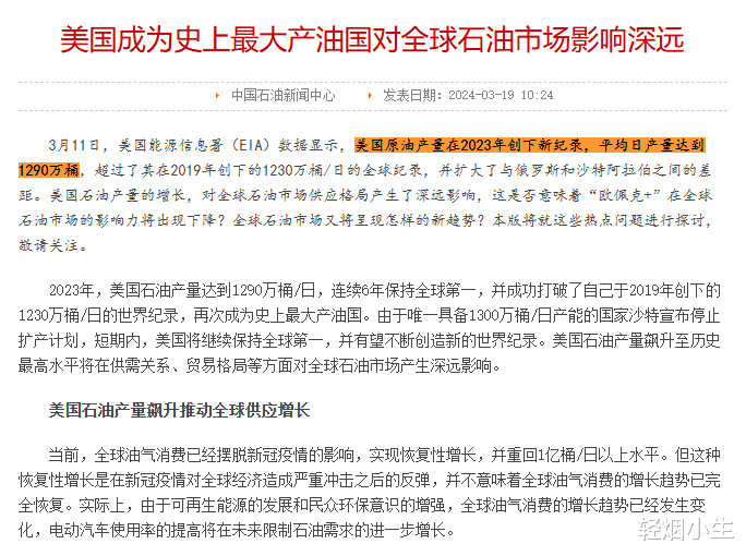 信息来源:中国石油新闻中心 2024-3-19 美国成为史上最大产油国对全球石油市场影响深远