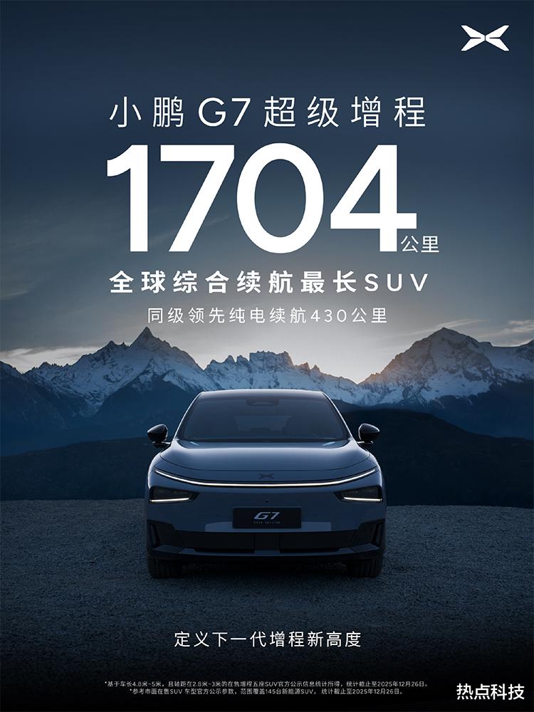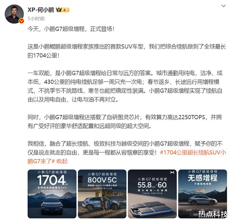 12月30日消息,今天,小鹏汽车董事长何小鹏在微博宣布,小鹏G7超级增程SUV正式登场,据悉,这将是小鹏鲲鹏超级增程推出的首款SUV车型,综合续航可达1704km,相当亮眼。