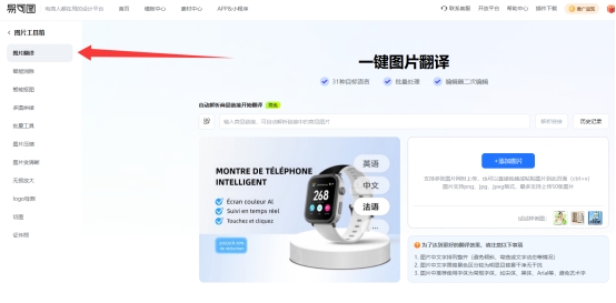 首先,大家可以打开易可图官网首页,找到左侧导航栏里的图片工具箱,从中找到图片翻译的功能入口。