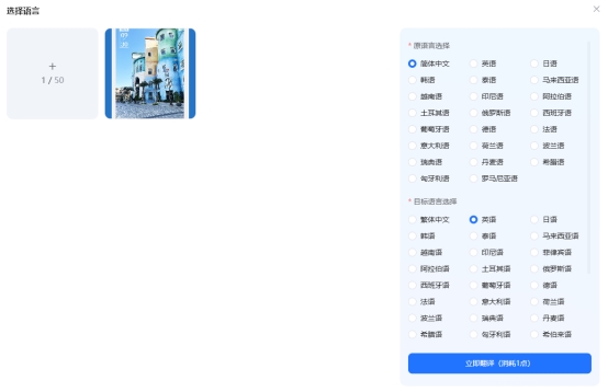 其次就是输入要翻译的商品图以及相应的两种语言,“原语言”为图片上的原文本所对应的语言(如简体中文),而“目标语言”则是我们想要将其翻译为目标的文字,比如英语、西班牙语等。