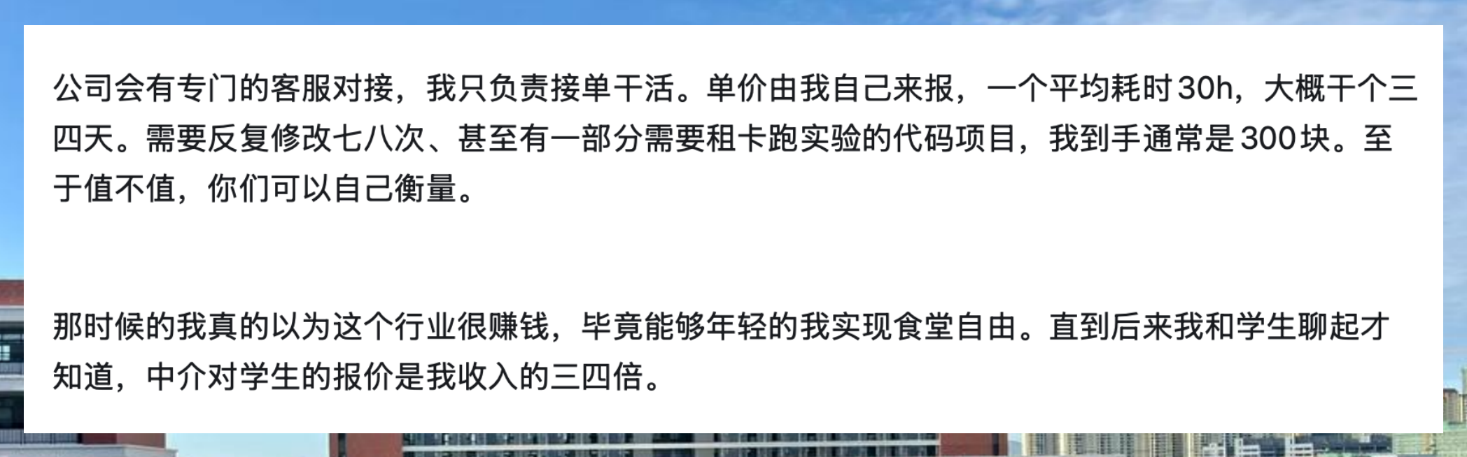 那时候,凭着一次代写赚300块,他成了宿舍里的“富豪”,早早实现了食堂点菜自由。直到后来他才知道,中介转头向学生报价1200元,甚至更高。那一刻他才明白,自己不过是剥削链最末端的廉价劳动力,连租显卡的钱都赚得勉强。