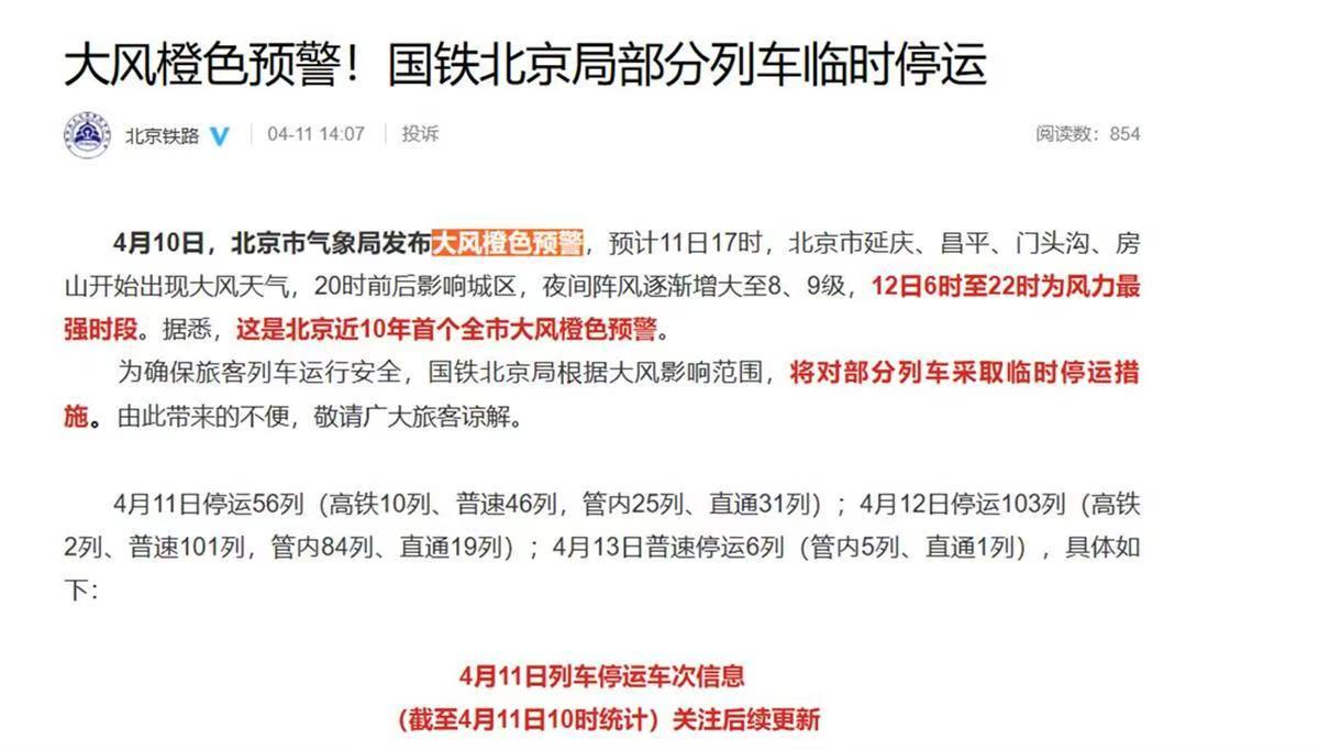 北京地区遭遇了一场突如其来的大风天气,给交通运输带来了严重影响。据铁路部门消息,为确保旅客列车运行安全,超百趟列车被迫停运,给广大旅客的出行带来了不便。