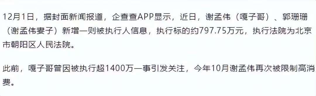 【环球网】谢孟伟(嘎子哥)夫妇,再被执行797万