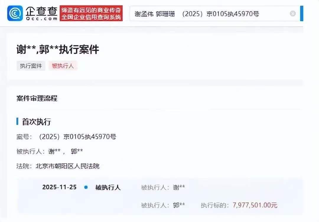 12月1日,有网友发现,谢孟伟和郭珊珊新增了一条被执行信息,执行标的约797.75万元。