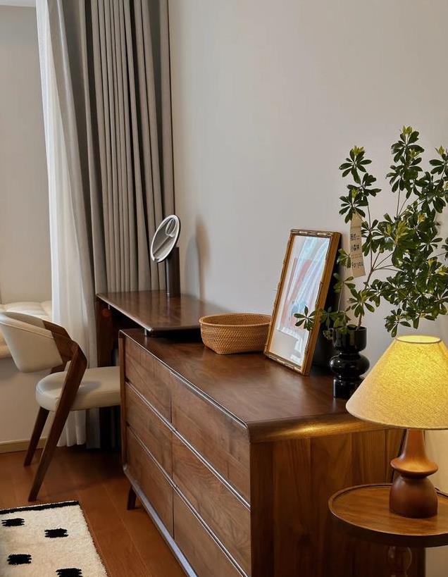 床尾到墙面的距离有1.1m,空间足够, 被用来放置黑胡桃木的梳妆台斗柜, 平常会收纳贴身衣物和日用品在这里,很实用。梳妆台更是女生的必备之物,配上一把舒适的椅子,就能舒适的护肤梳妆了。