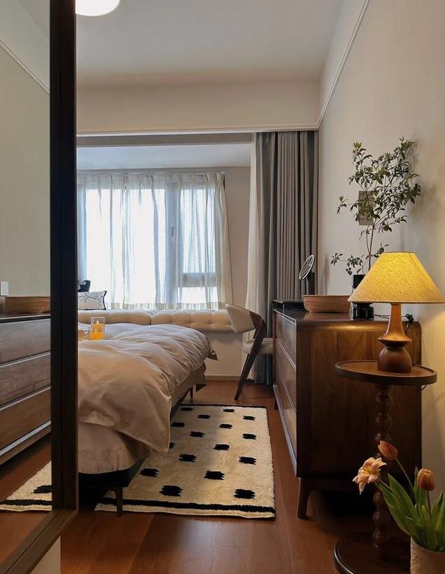 这里的飘窗是不可拆除的,那就用起来吧,铺上软软的飘窗垫,用窗帘和睡眠空间分隔开,仿佛让卧室多了一个小床,在一些必要的时候,还可以分担卧室的睡眠区有限的压力。