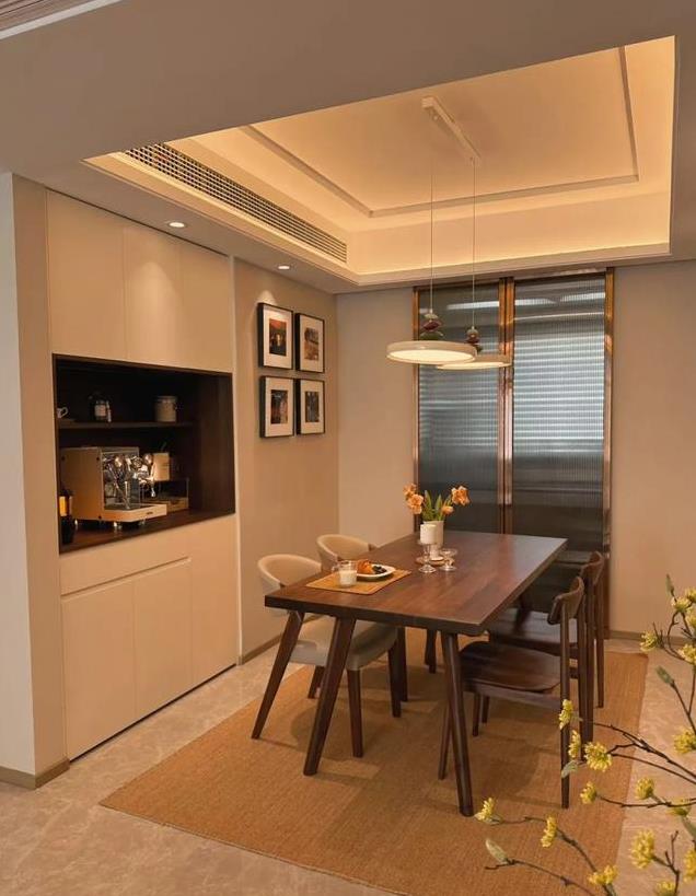 餐厅原本的空间是没有任何做餐边柜的位置的,又很想拥有一个餐边柜,怎么办呢?那就把能拆除的墙面拆了吧,利用原本墙体的空间做餐边柜,增加餐厅的整体收纳能力。