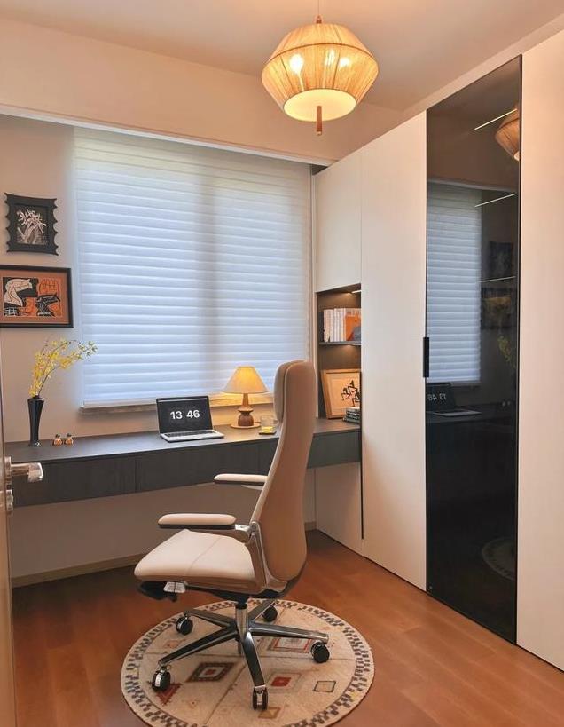 房间是朝北的,书桌靠窗也不会有阳光直射, 靠墙则是做了展示柜、储物柜、衣柜的设计, 可以满足我生活中不同的使用需求。配色是以奶油白和烟熏深灰色为主, 搭配复古吊灯和杏仁黄的办公椅, 再点缀一些小幅挂画,铺上圆形地毯, 看起来很温馨呀!