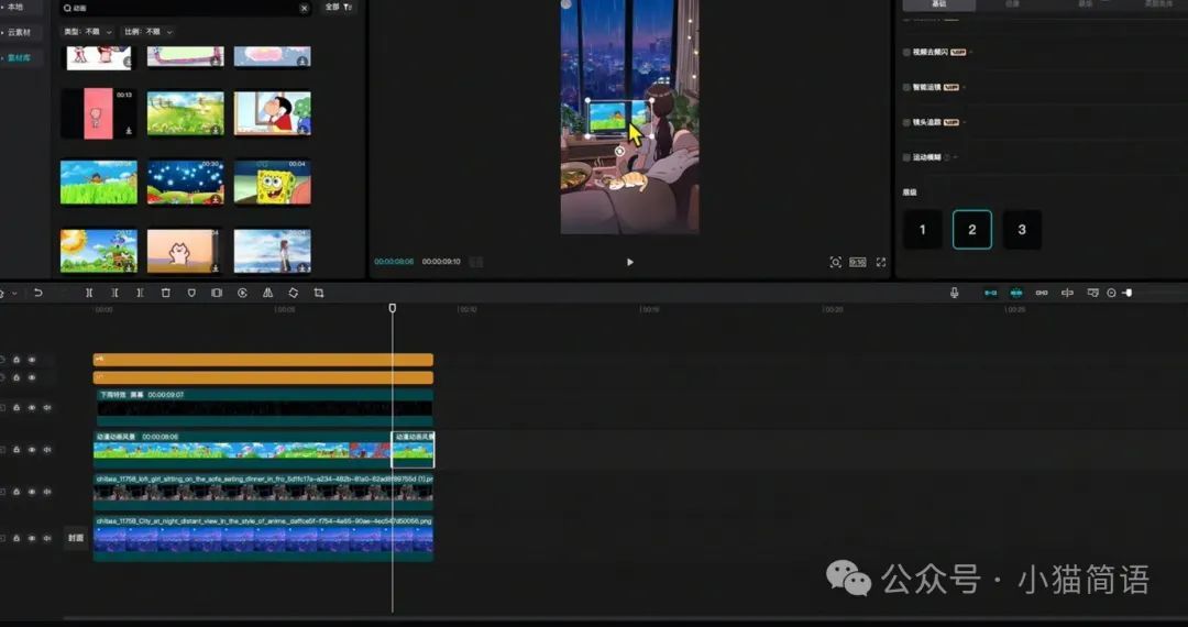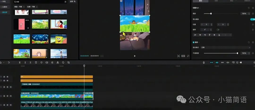 然后点击素材搜索动画,选择一个动画视频,添加到主轨道,调整大小和层级,放在电视屏幕的位置就搞定了。