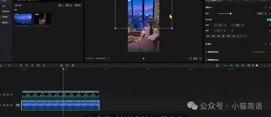 接着我们打开剪映,将图片素材拖进来,注意要将窗外风景放在主轨道,室内图放在上方,这样风景就跑到窗外去了。