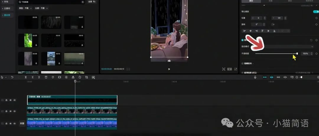 接着我们需要制作窗外的雨景,点击素材搜索下雨黑幕,然后拖到时间轴的上方,选择基础,拉到下方更改层级, 雨水就在窗外了,为了看到雨水,需要降低下雨素材透明度为30%左右。