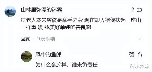 扶老人本来应该是举手之劳 现在却弄得像扶起一座山一样重 哎 我美好单纯的善良啊