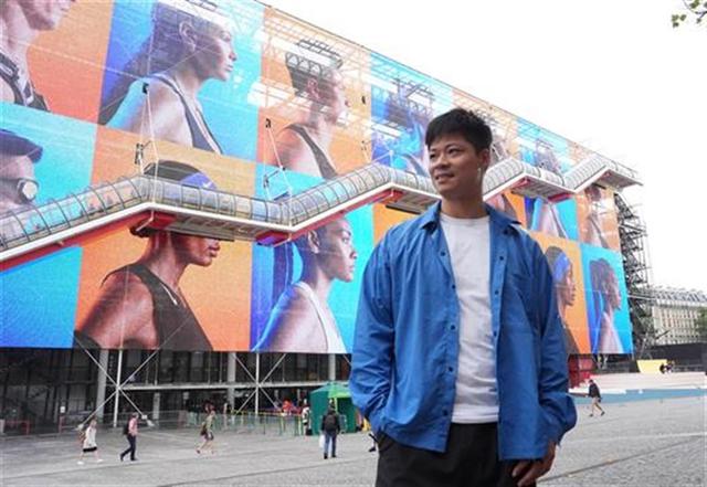 7月27日,苏炳添在蓬皮杜艺术中心外留影(图源:新华社)