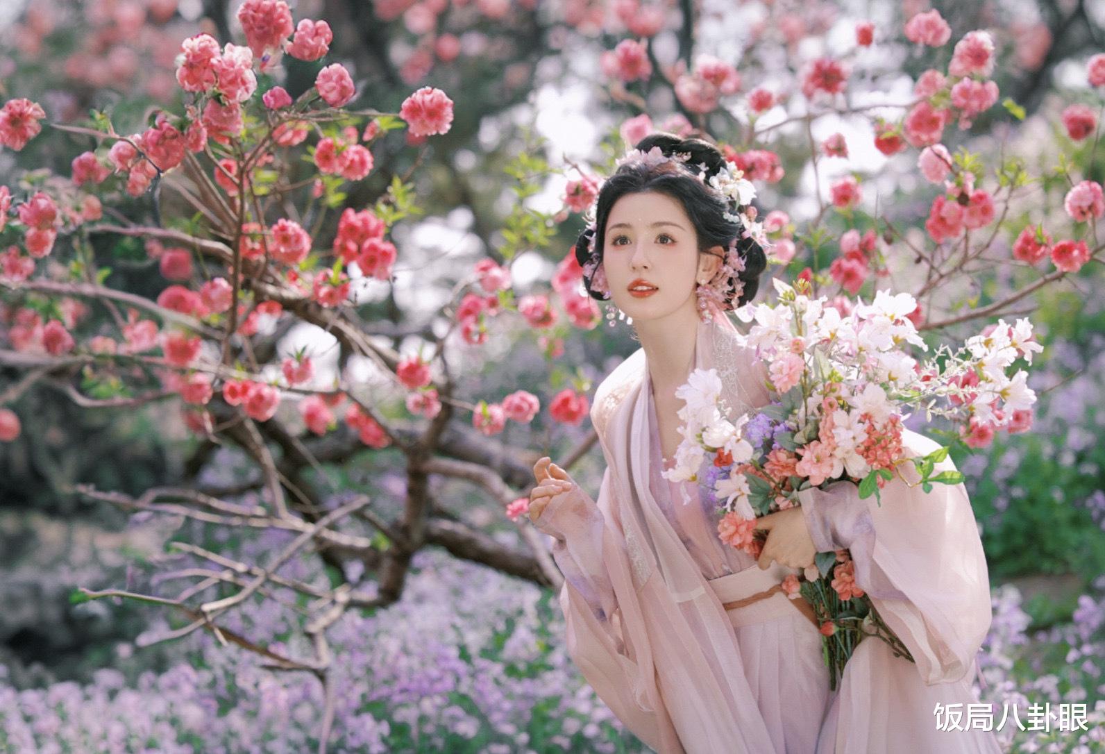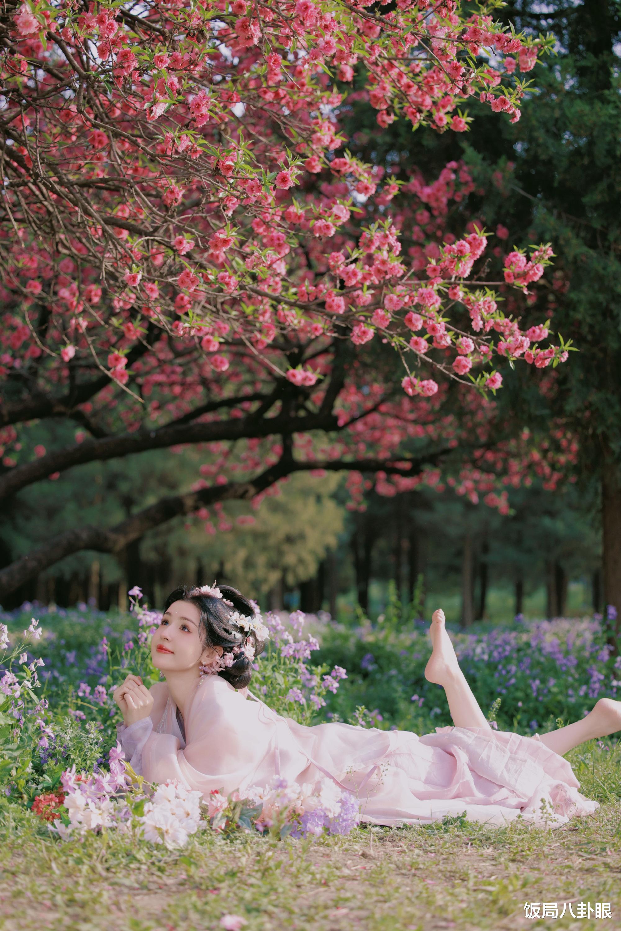 在繁花盛开的树林间,她或坐或躺,姿态悠闲自在,与周围的自然景色完美融合,美得让人移不开眼。在湖边,她倚靠着石头,衣袂飘飘,仿佛从古代画卷中走出来的仙子。