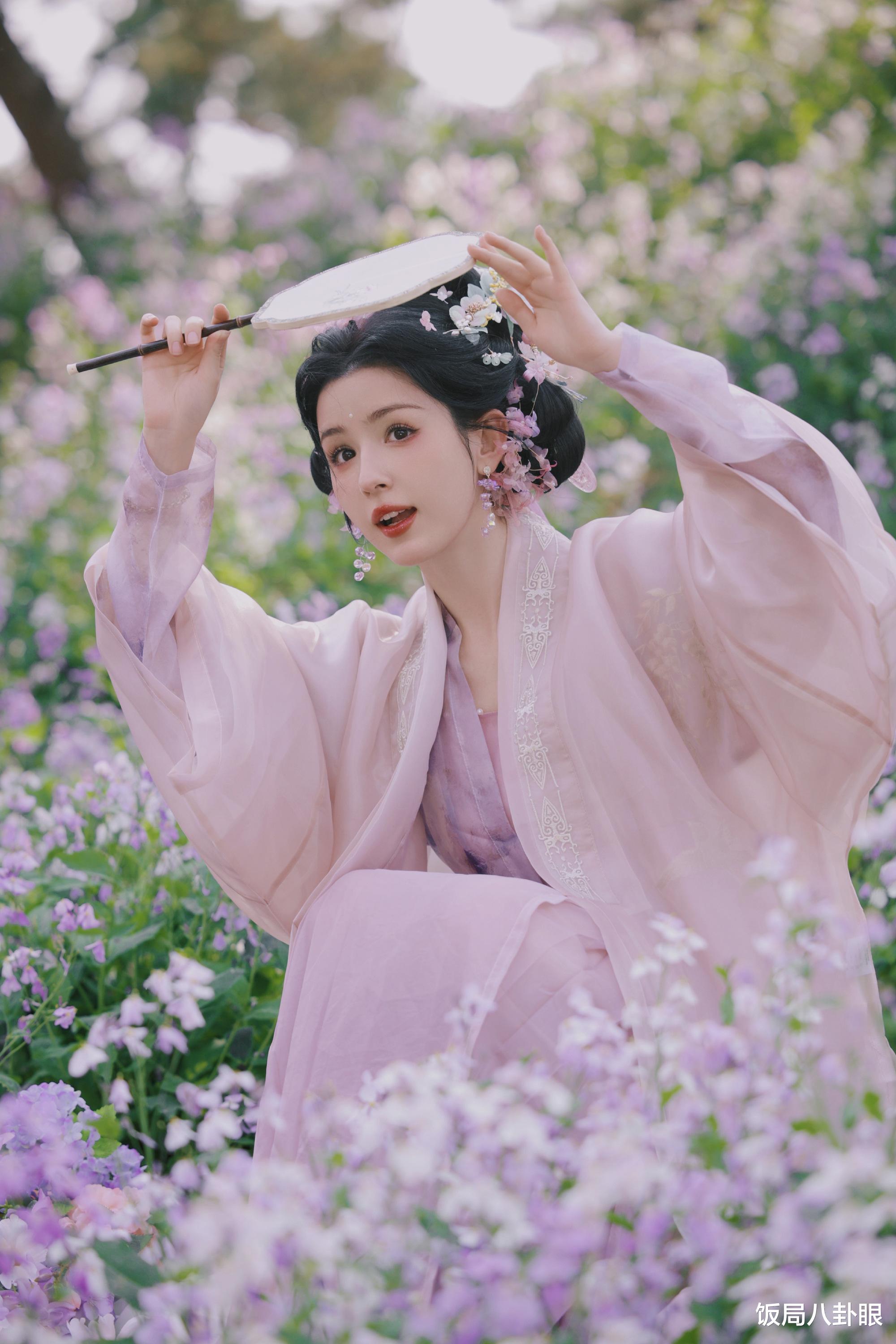 照片里,哈妮克孜身着一袭浅粉色的古装长裙,那轻柔的面料随风飘动,就像云朵一样轻盈。她的发髻精致无比,点缀着多彩的花朵发饰,仿佛把春天都戴在了头上。她手持绘有精美图案的手鞠球,或是轻摇团扇,眉眼间尽是古典的韵味。