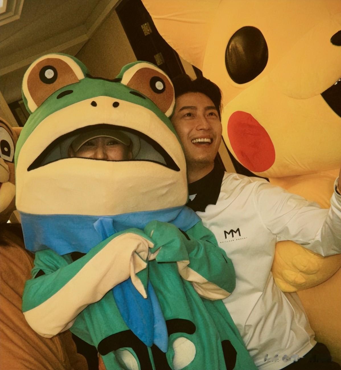 何超莲藏在青蛙服里突然跳出来,窦骁先是懵了两秒,接着笑得嘴都合不拢,一把抱住何超莲转了个圈。