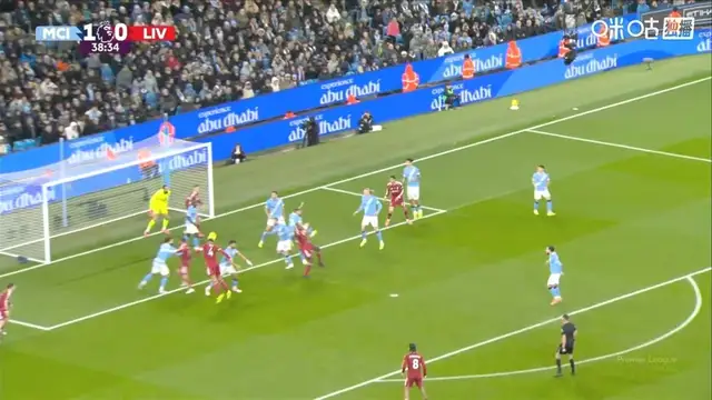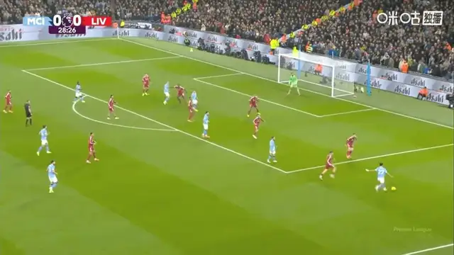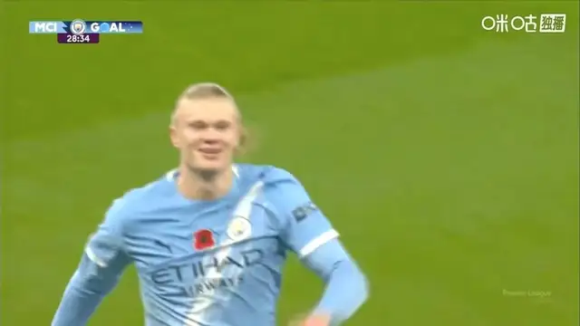 第28分钟,曼城首开纪录,努内斯右路传到禁区后点,哈兰德高高跃起力压科纳特头球破门,曼城1-0利物浦。