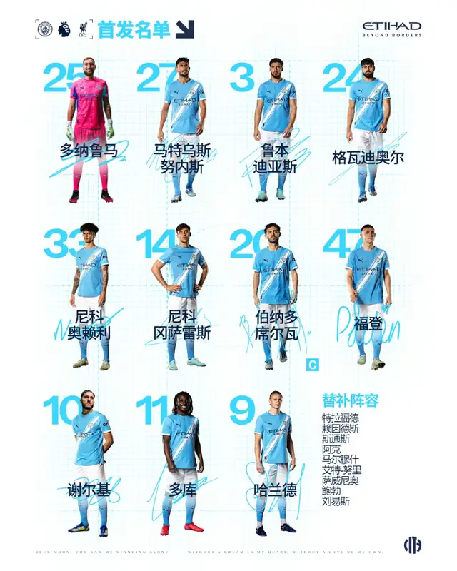 曼城首发:25-多纳鲁马、3-鲁本·迪亚斯、24-格瓦迪奥尔、33-奥赖利、27-努内斯、4-尼科·冈萨雷斯、20-B席、10-谢尔基、11-多库、47-福登、9-哈兰德