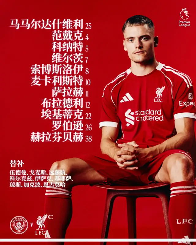 利物浦首发:25-马马尔达什维利、12-布拉德利、4-范戴克、5-科纳特、26-罗伯逊、38-赫拉芬贝赫、8-索博斯洛伊、10-麦卡利斯特、11-萨拉赫、7-维尔茨、22-埃基蒂克