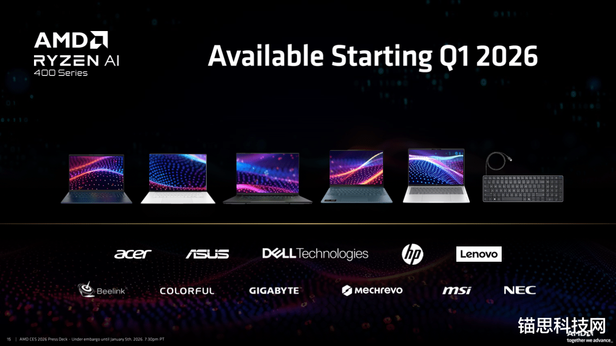 搭载AMD锐龙 AI 400 系列与AMD锐龙 AI PRO 400 系列处理器的系统将于2026年第一季度起陆续上市,由宏碁、华硕、戴尔、惠普、技嘉和联想等主要 OEM 厂商推出。此外,搭载锐龙 AI 400 系列处理器的台式机产品预计将于2026年第二季度起上市。