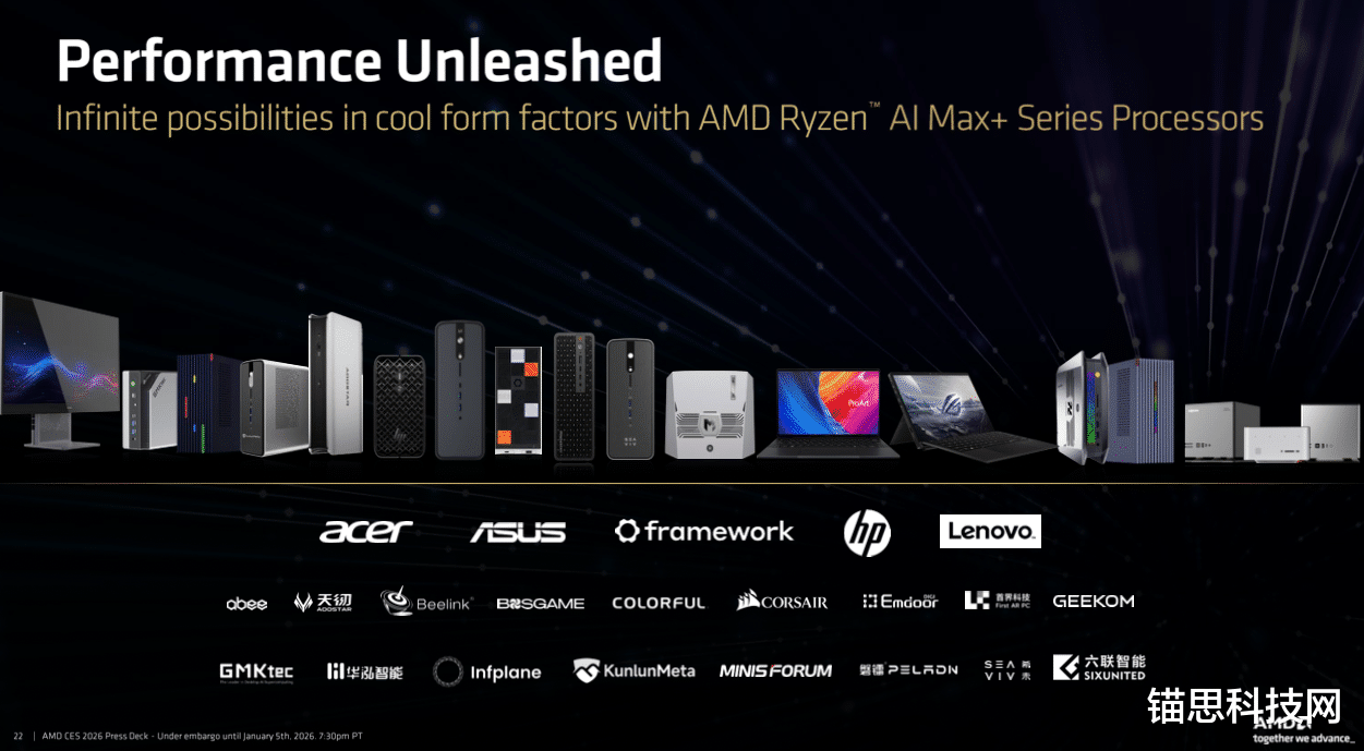 搭载全新 AMD锐龙 AI Max+ 系列处理器的系统将于 2026 年第一季度起陆续上市,首批产品将由宏碁和华硕等主要 OEM 合作伙伴推出,预计在全年内还将有更多搭载该系列处理器的系统陆续发布。