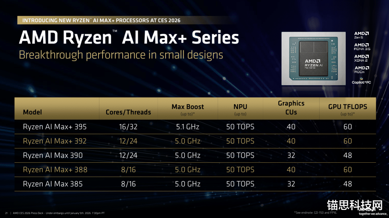 AMD宣布推出锐龙 AI Max+ 392与锐龙 AI Max+ 388 处理器,作为 锐龙 AI Max+ 系列的新成员,将高性能 AI 计算能力、集成的桌面级显卡性能以及统一内存架构引入高端超轻薄笔记本、工作站以及紧凑型迷你PC。得益于良好的早期采用率,锐龙 AI Max+ 处理器助力 OEM厂商打造 Windows 11 AI + PC,在不牺牲便携性与用户体验的前提下,同时优化高强度创作与 AI 工作负载以及沉浸式游戏体验。