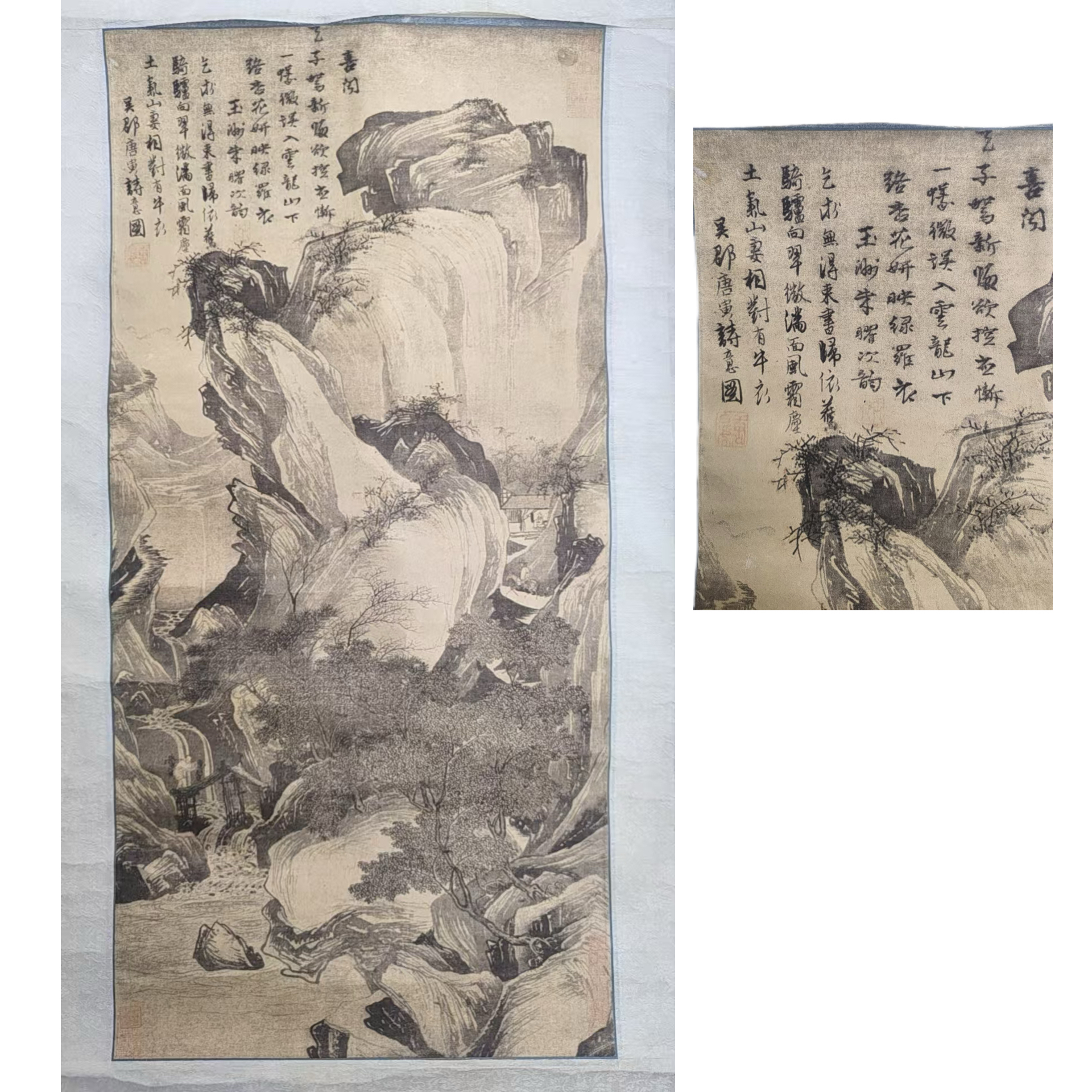 笔墨语言的集大成与创新:唐寅在画中融合了宋元诸家之长:山石以“斧劈皴”为主,却以“侧锋轻扫”弱化南宋院体的刚硬棱角,赋予水墨灵动性;树木以“蟹爪枝”“点叶法”结合,既保留北宋山水的骨力,又融入元代文人画的写意精神。更妙的是,他以“淡墨晕染”营造出山水的“烟岚浮动”感,这种“刚柔并济”的笔墨语言,成为明代文人画“院体与文人融合”的典范,对后世“吴门画派”乃至清代“四王”的山水创作产生深远影响。