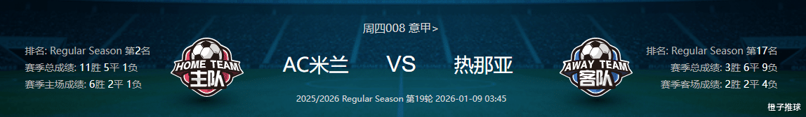 AC米兰上个赛季球队表现不佳,仅仅取得联赛第8名。本赛季球队在主帅阿莱格里的带领下,想要重返积分榜前列,争取拿下意甲联赛冠军。目前球队取得了11胜5平1负,排名意甲联赛积分榜第2名,只有持续的取胜,才会不至于掉队。在上一轮的比赛,球队凭借前锋莱奥下半场的唯一进球,最终以1-0拿下对手。在综合实力方面,AC米兰比热那亚强大太多,前锋上线的攻击力以及后防线的稳定性,保证了球队的实力,本轮双有主场天时地利人和的优势。