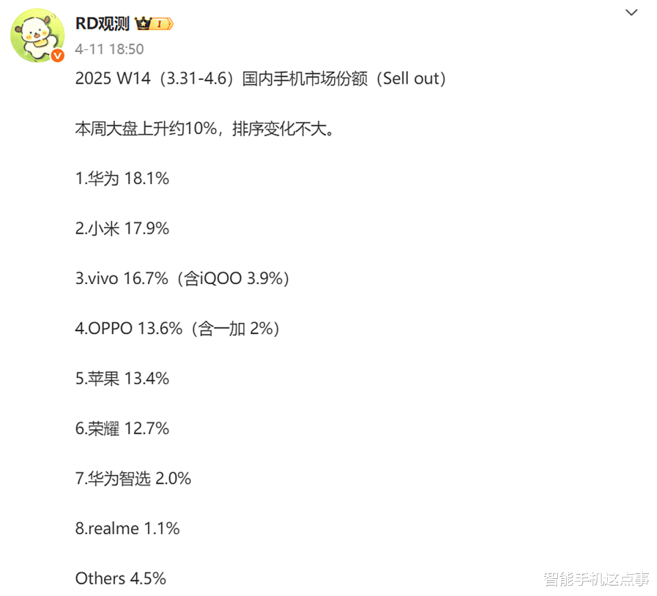 在全球经济复苏步伐放缓的背景下,中国智能手机市场却呈现出逆势而上的活力,原因是根据市场披露的2025年第14周市场监测数据,国内手机单周激活量同比增长10%。