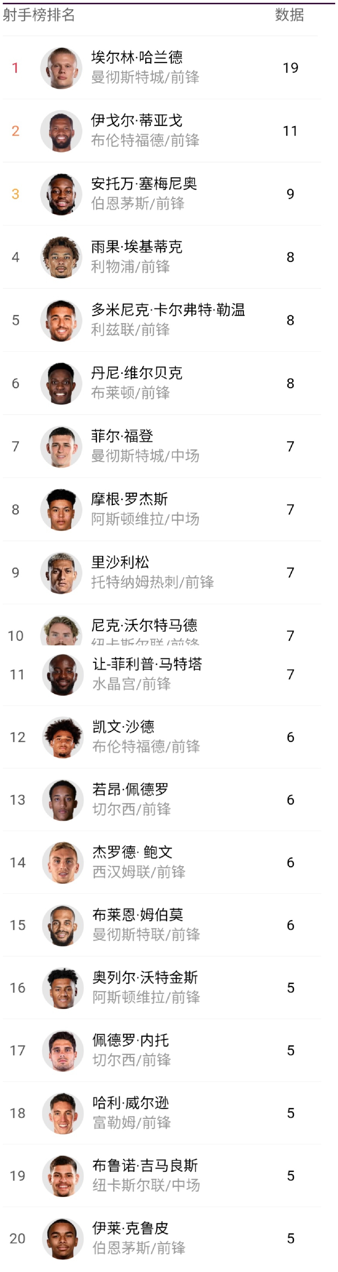 英超最新射手榜情况:射手榜变化不大,主要是哈兰德领先优势比较大,其他球员很难撼动哈兰德的位置,除非哈兰德之后连续缺席,要不然英超金靴基本属于哈兰德的。