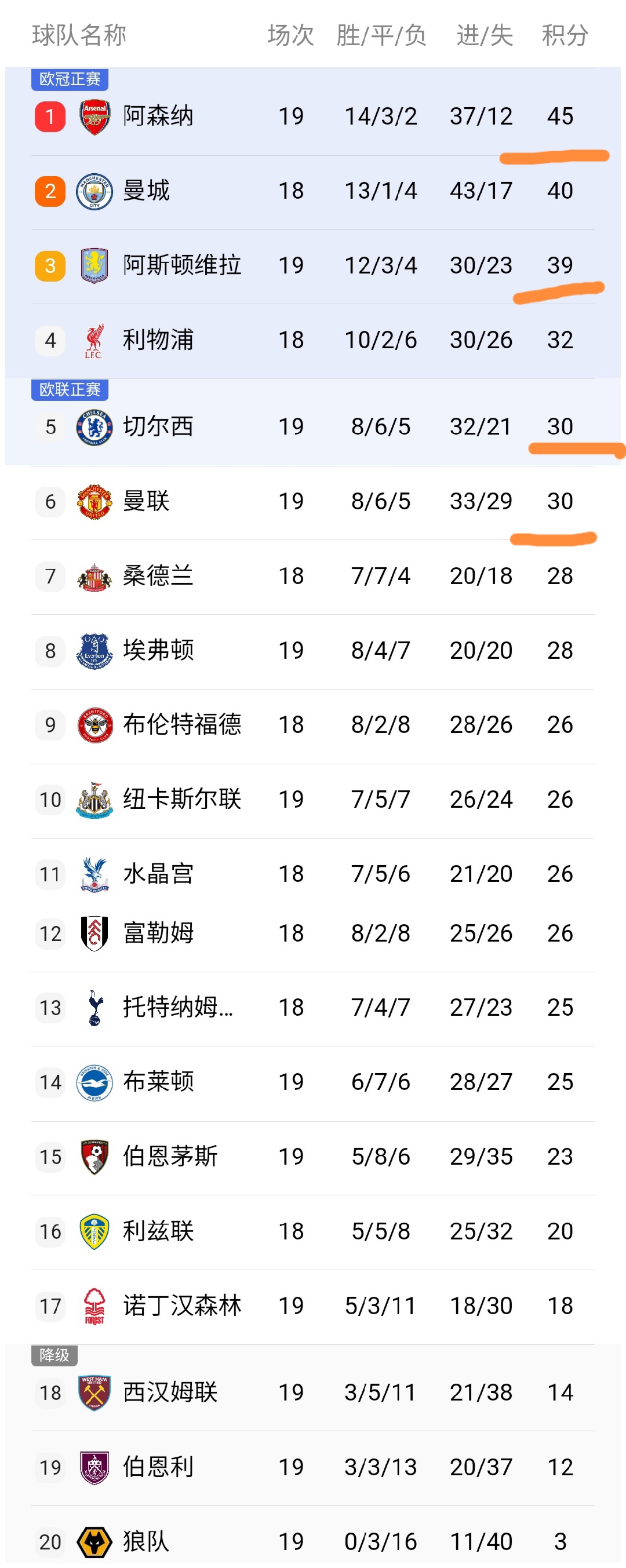 英超最新积分榜情况:可以看到阿森纳本轮击败争夺劲敌维拉队之后,积45分领跑,比第2的曼城多了5分,稳居榜首,即使本轮曼城赢球也无法超越阿森纳,而维拉输球之后,目前比阿森纳少了6分,争冠形势对于维拉不利。曼联和切尔西本轮都爆冷受挫,其中曼联最为可惜,如果曼联本轮赢下了狼队,就可以反超切尔西的,但是曼联自己不争气,在切尔西打平之后,曼联自己没有把握住机会。可以说维拉可能会在争冠集团慢慢掉队了,阿森纳太强势了,或许只有曼城才有可能跟阿森纳争一争冠军了。