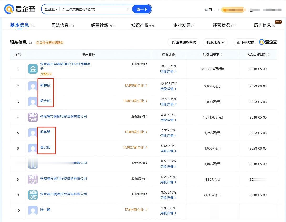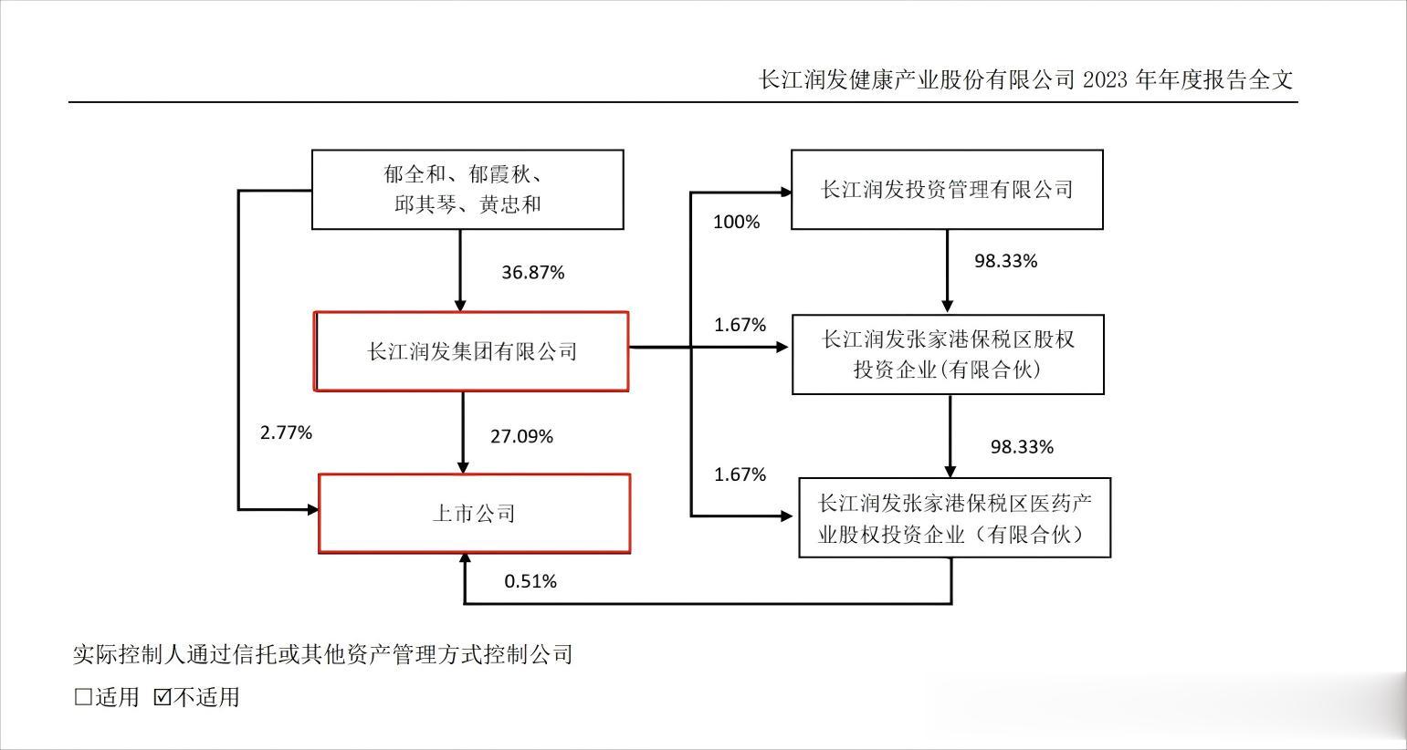 控股股东润发集团成立于1994年,公司位于江苏张家港市金港镇长江村,村委会对润发集团持股18.49%,郁霞秋是长江村的党委书记,郁霞秋、郁全和、邱其琴、黄忠和这四人对润发集团的合计持股比例远超村委会。因此,四人构成了对长江健康、润发集团的实际控制关系。