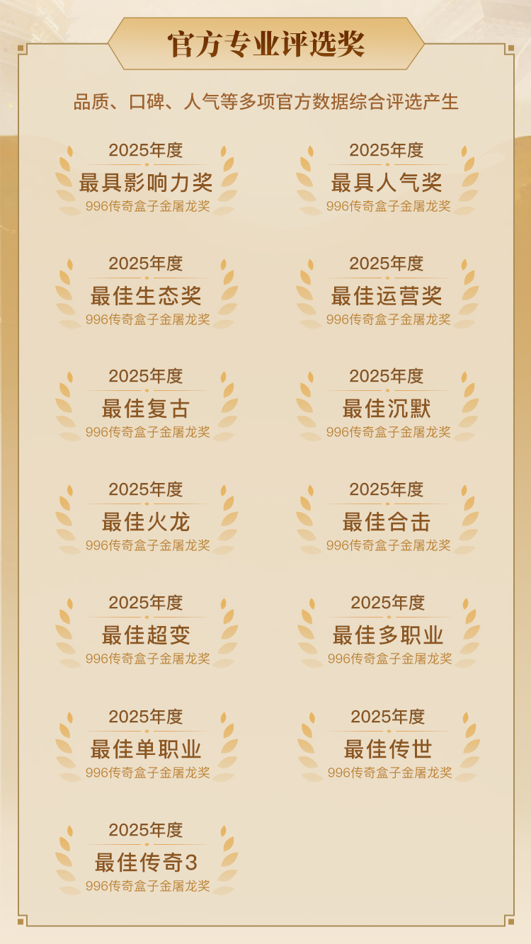 如今,传奇的这把“刀”以全新的形式归来,它就是996传奇盒子为千万玩家铸造的金屠龙奖-2025年度传奇大赏!奖项融合业内甄选和玩家共鸣,旨在全体传奇玩家参与评选最好玩、最具品质、最具人气的年度传奇玩法,为王者加冕!