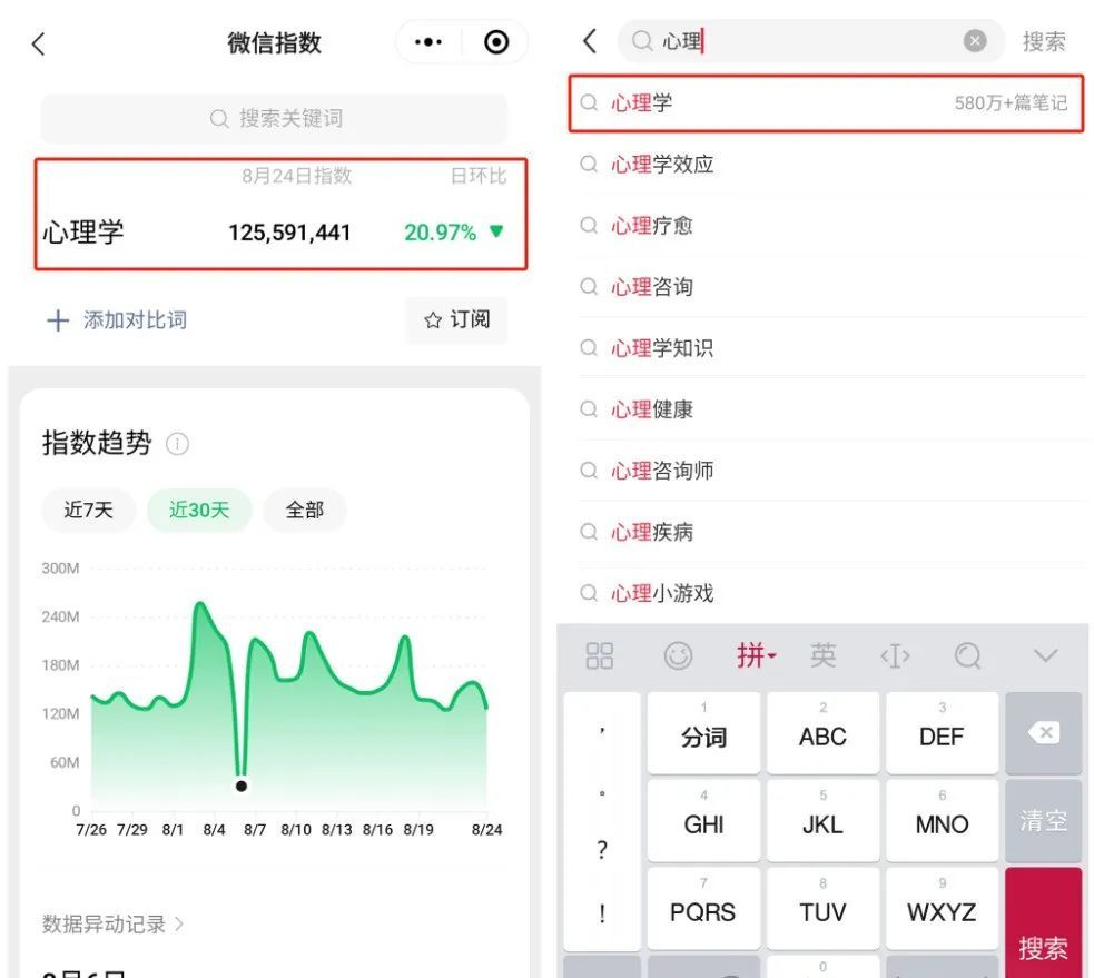 微信搜索指数搜一下“心理学”,仅这个关键词日均搜索量就有1.2个亿!小红薯更是离谱,居然有将近600万篇相关标签的笔记!拿数据来说话,那也是真的火!