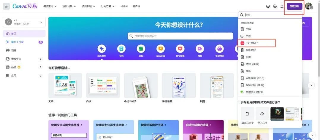 打开Canva,点击创建设计,选择小红书帖子