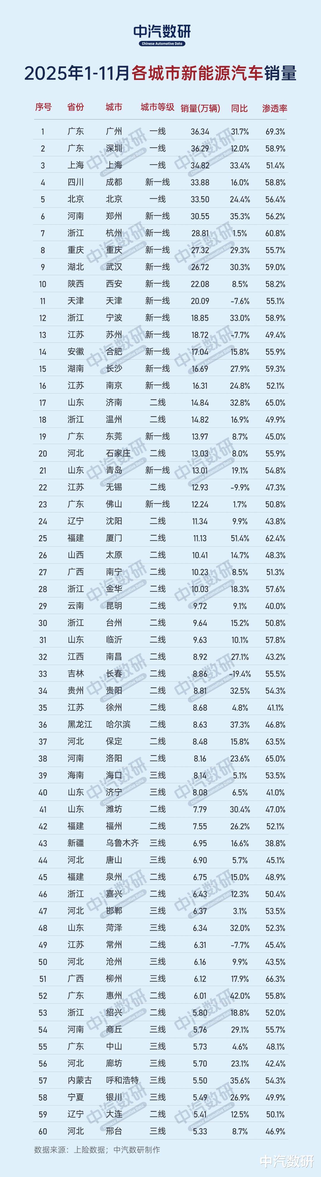 1-11月新能源汽车累计销量排名中,广州稳居冠军宝座,累计销量为36.34万辆,同比增长31.7%,新能源车渗透率近70%。紧随其后的是深圳,累计销量36.29万辆,同比增长12%,渗透率58.9%。第三名是上海,累计销量34.82万辆,渗透率51.4%。