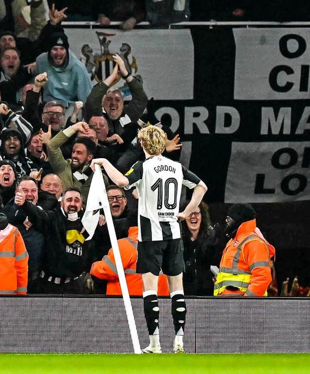 易边再战,纽卡斯尔迅速扩大战果。第52分钟,墨菲右路低平球传中,伊萨克晃开角度起脚劲射,拉亚将球扑出,戈登拍马赶到补射入网,2-0!进球之后,戈登跑到角球区复刻了亨利的经典庆祝