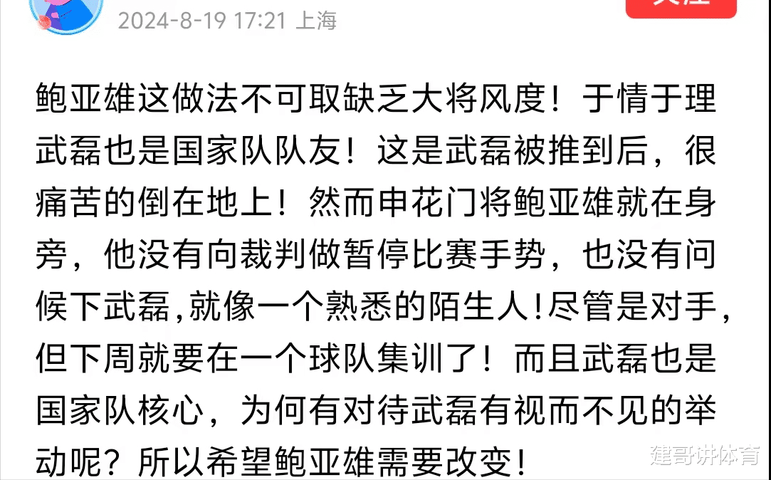 当武磊快攻过程中被铲翻痛苦的倒在鲍亚雄的面前时,鲍亚雄连看都不看地上翻滚的武磊,就是支持武磊的沪媒和球迷生气的主要原因,鲍亚雄不理武磊,或许是他感觉武磊有演戏的成分,也或许他见过太多武磊倒地翻滚的场面,才让他如此的无动于衷,不过沪媒对于鲍亚雄这种无视武磊的情况,也提出了3个问题针对鲍亚雄。