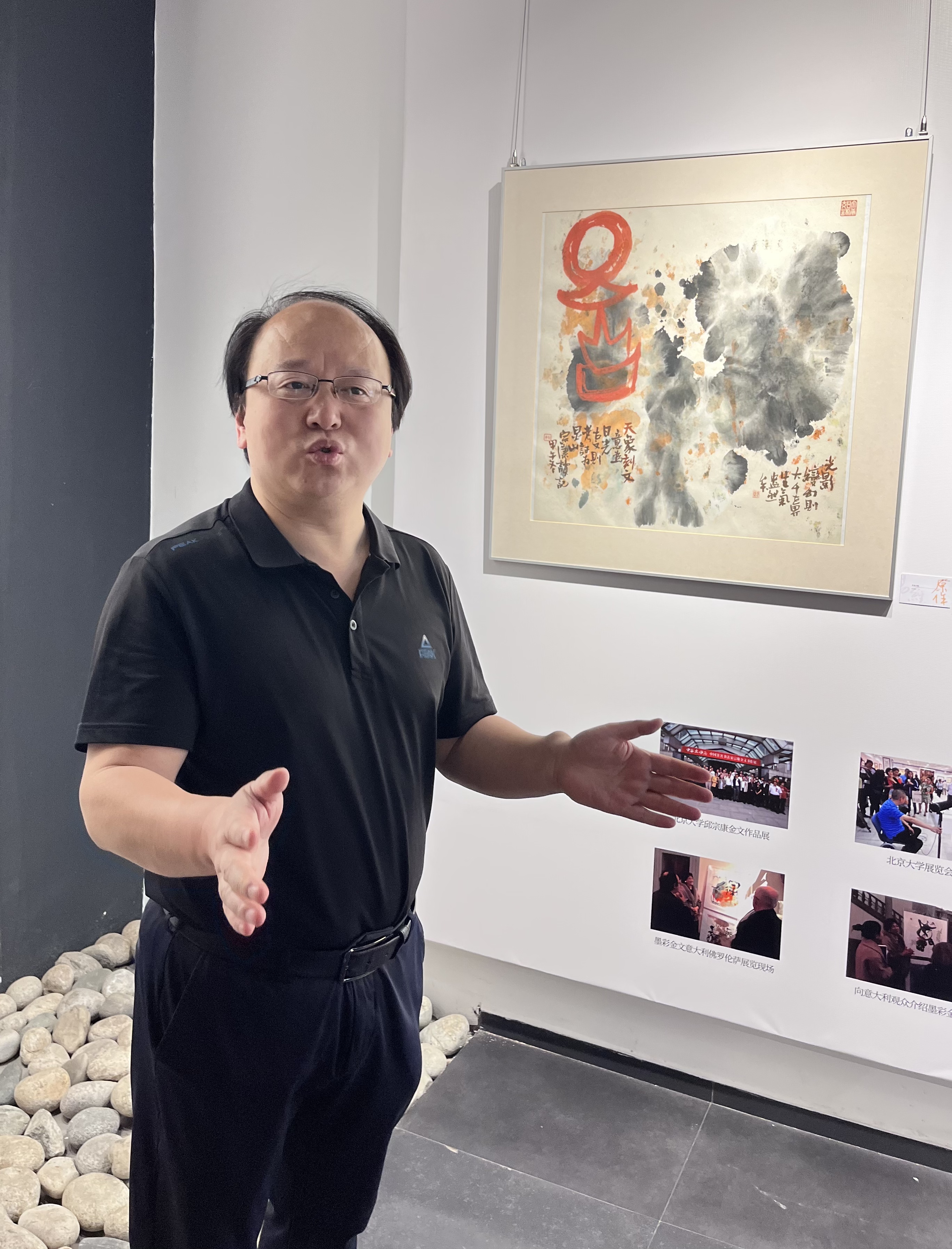 而墨彩金文展示单元中,特制展柜灯光下,由宗康先生原创调色的靛蓝、朱砂等矿物色彩,与墨色金文笔法共同形成了一次跨域古今的时空对话。
