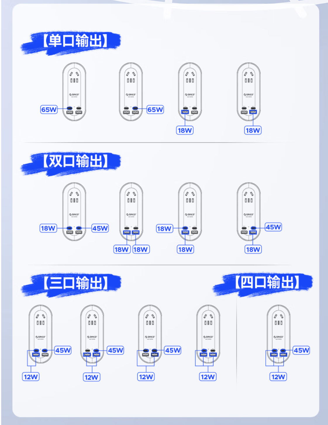 奥睿科(ORICO)65w氮化镓口袋插排不但体积小,而且接口超多,不但有3个国标220V插座,还有4个USB充电接口,总功率达2500W,可以说是一拖多搞定全身设备的用电需求!