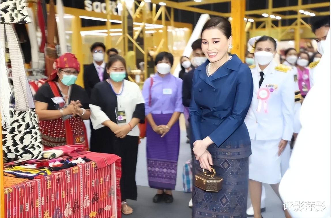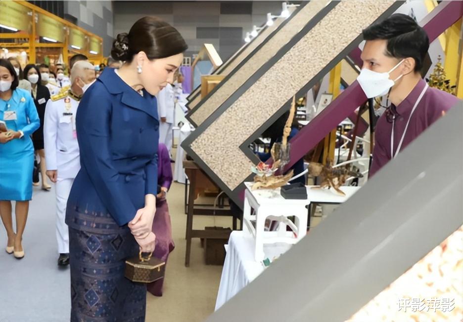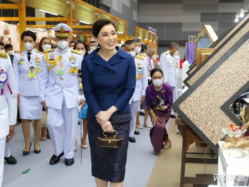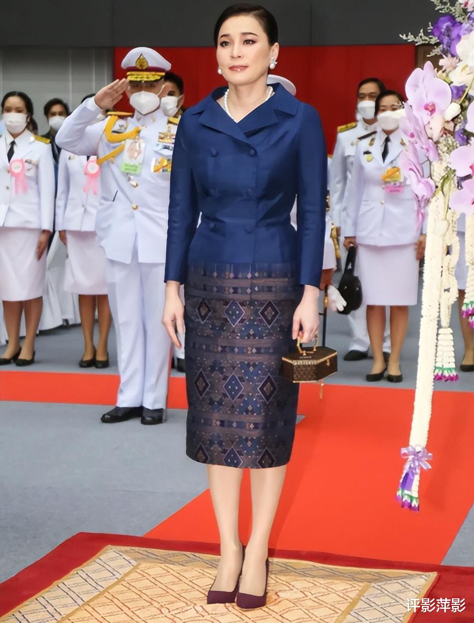 不再是常见的泰式宫装,苏提达换了一身皇室蓝的西服上装,配以花纹短裙,拎着在加冕礼上拎过的宫廷工艺手袋,春风满面笑容无敌。
