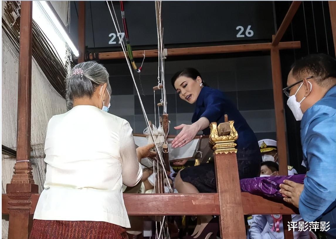 在尝试织布机的时候,苏提达兴致勃勃十分感兴趣。这点非常重要,要知道她婆婆诗丽吉在王室历史备受尊敬,很重要的一点就在于她对于泰国传统丝织产业的重视,以及对于泰丝走进国际的不断推动和支持。苏提达一直号称要全面继承婆婆的优秀,这类传统手工艺自然是不能忽视的。
