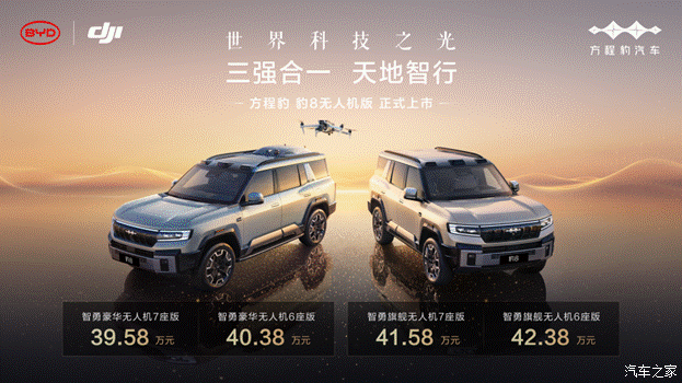 三强合一,方程豹豹8无人机版正式上市发布会上,方程豹豹8无人机版正式上市,豹8全系可选装智能车载无人机系统,售价39.58~42.38万元。豹8无人机版,作为比亚迪智能车载无人机系统首搭车型之一,融合了比亚迪、大疆、华为,三大科技巨头的顶尖技术,搭载DMO电驱越野开创平台、华为乾崑智驾ADS 3.0和“灵鸢”智能车载无人机系统,将为用户带来全新的智能硬派出行体验!