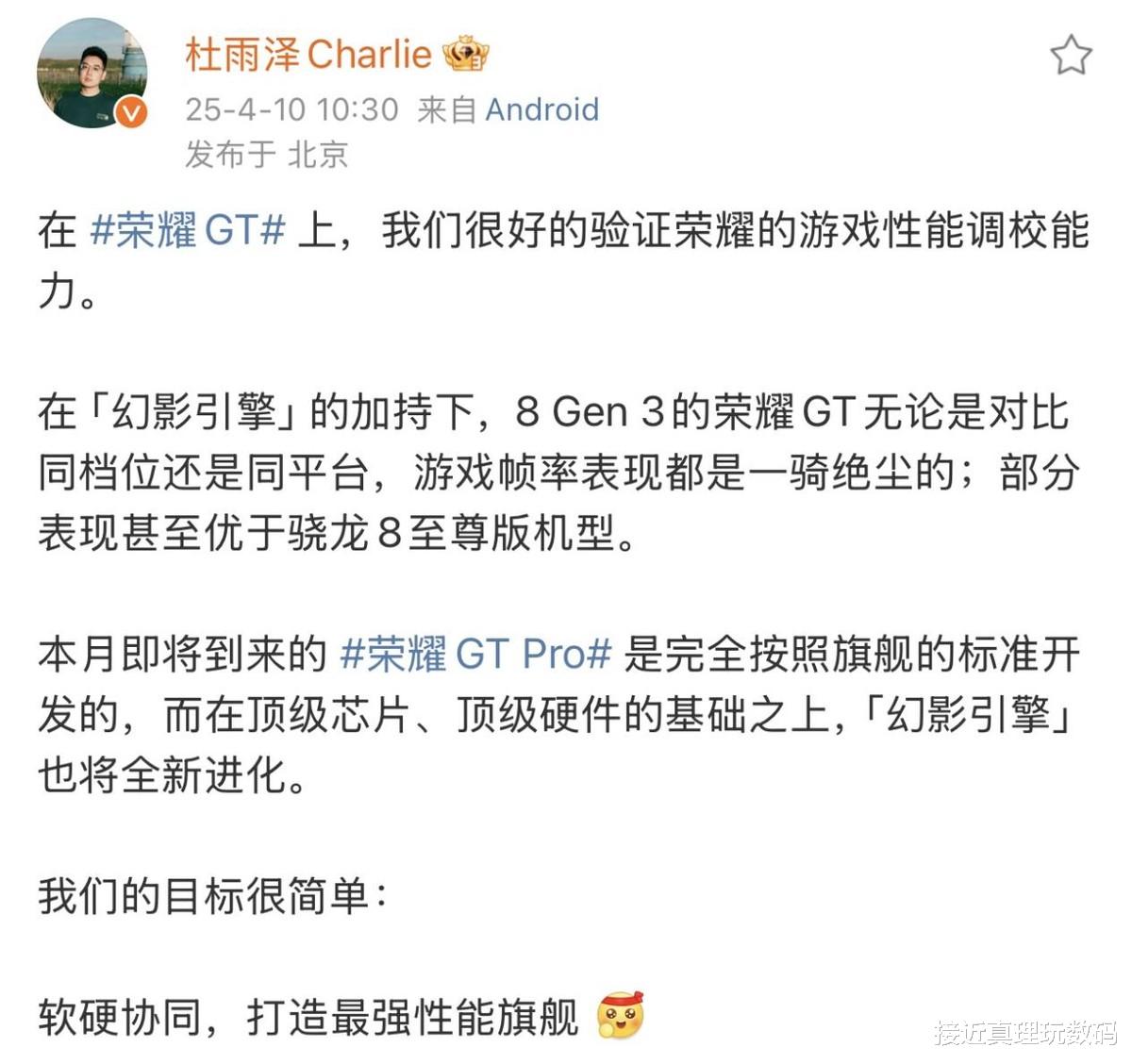 此前,产品经理杜雨泽明确表示,荣耀GT Pro的价格定位将“比荣耀GT高两个档”。这也清晰地表明了其市场定位——向更高阶的性能旗舰市场发起冲击。以“最强性能旗舰”为目标,意味着荣耀不仅要在性能上做到极致,更要在综合体验上达到顶级水准,才能在激烈的市场竞争中站稳脚跟,并支撑起更高的价格区间。荣耀GT Pro的最终表现如何,4月23日,一同见证!