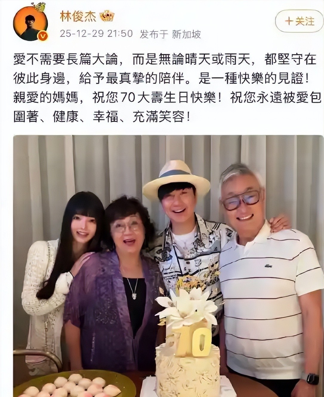 昨晚刚吃完宵夜刷手机,就看到林俊杰发了全家福。本来说是给他妈70大寿庆生,结果照片里多了个年轻女孩,站他妈妈旁边,手还搭着肩膀,笑得挺甜。一开始我还以为是亲戚家女儿,结果不到一小时热搜就炸了——林俊杰官宣了。