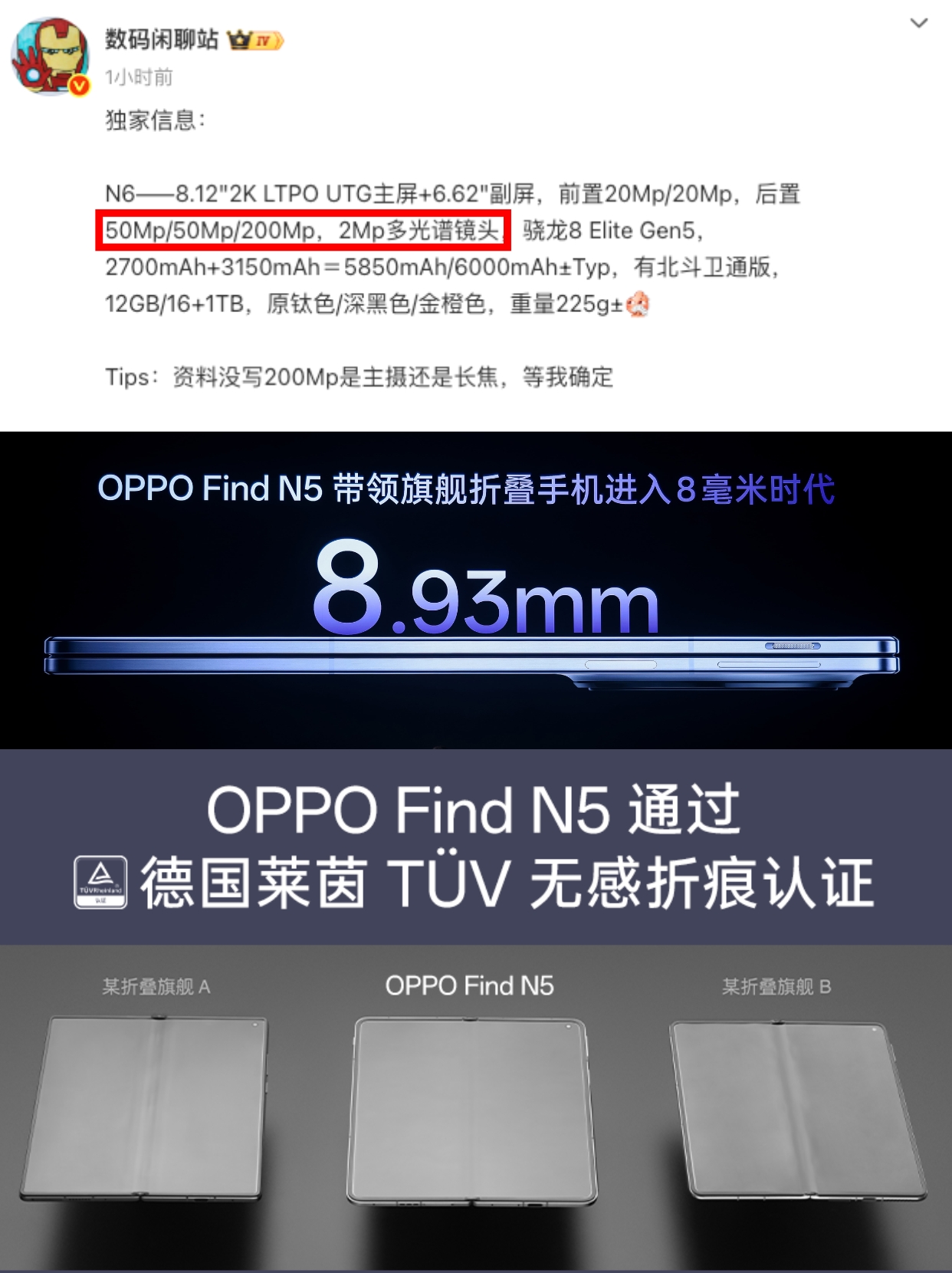 先不说还没发布的折叠,其实2025年2月发布的OPPO Find N5就已经做到8.93mm,和iPhone 17 Pro Max差不多,比iPhone Fold现在爆料的9.6mm薄不少,而且重点是别人还有长焦啊。。。听说疑似在26年Q1发布的OPPO Find N6更薄,还用了2亿像素,虽然目前不知道2亿是主摄还是潜望长焦,但是这配置怎么看都更香,就更别说还有折叠里面最大的6000mAh电池了。