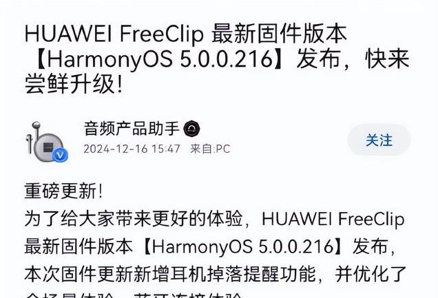 如果你有华为FreeClip的话,那么现在可以升级到最新的鸿蒙OS5.0.0.216版本,这个版本新增加了耳机掉落提醒功能,同时还优化了全场景的体验,还有蓝牙连接上的体验。